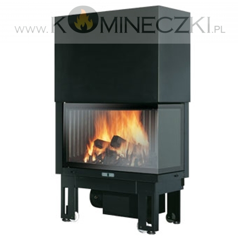 Zamknięty, elegancki wkład kominkowy o stalowym korpusie z podnoszonymi do góry drzwiczkami narożnymi.