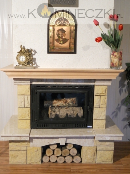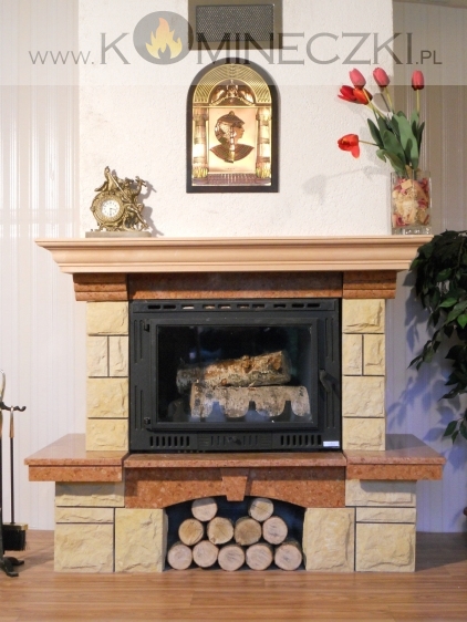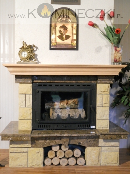 Obudowa kominka przedstawionego na zdjęciu wykonana jest z żółtego piaskowca oraz marmuru naturalnego.