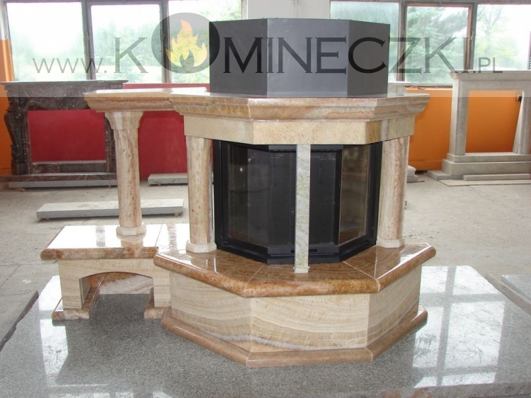 Obudowa kominka przedstawionego na zdjęciu wykonana jest z kamienia naturalnego marmuru rosso verona oraz breccia sarda.