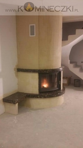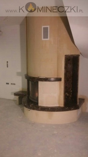 Kamienną obudowę kominka , widoczną za zdjęciu,  wykonano  z frezowanymi blatami. Obudowa kominka  oraz zabudowa