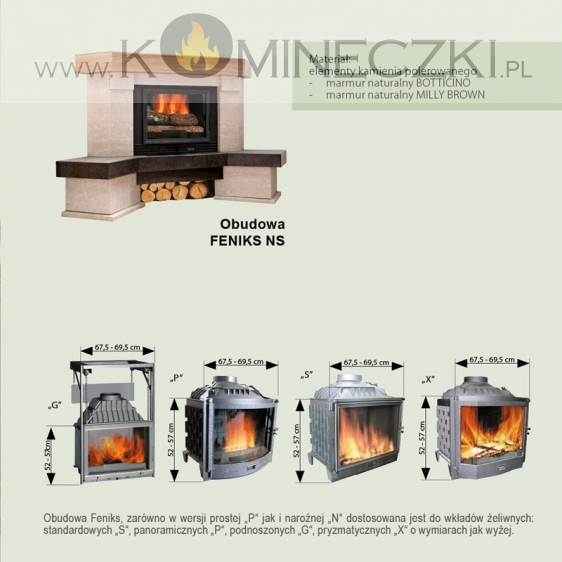 Kominek  Feniks w wersji prostej jak i narożnej dostosowany jest do wkładów z szybą prostą, panoramiczną oraz