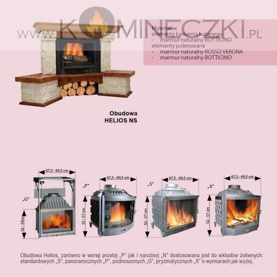 Kominek  Helios w wersji prostej jak i narożnej dostosowany jest do wkładów z szybą prostą, panoramiczną oraz