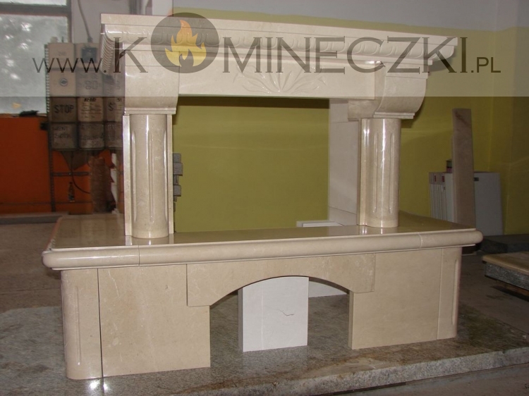 Obudowa kominka przedstawionego na zdjęciu wykonana jest z marmuru Crema Marfil.
