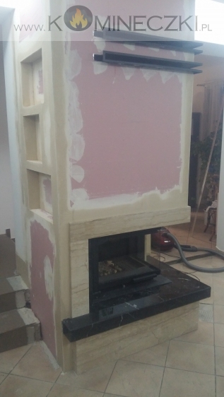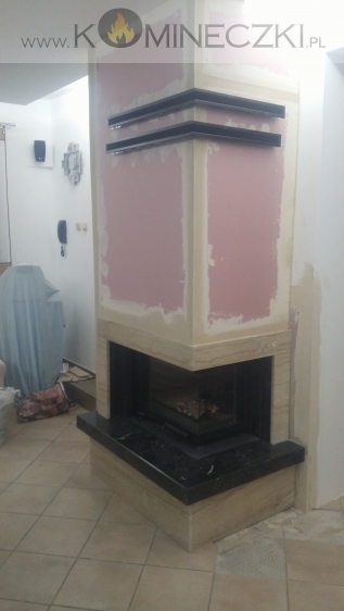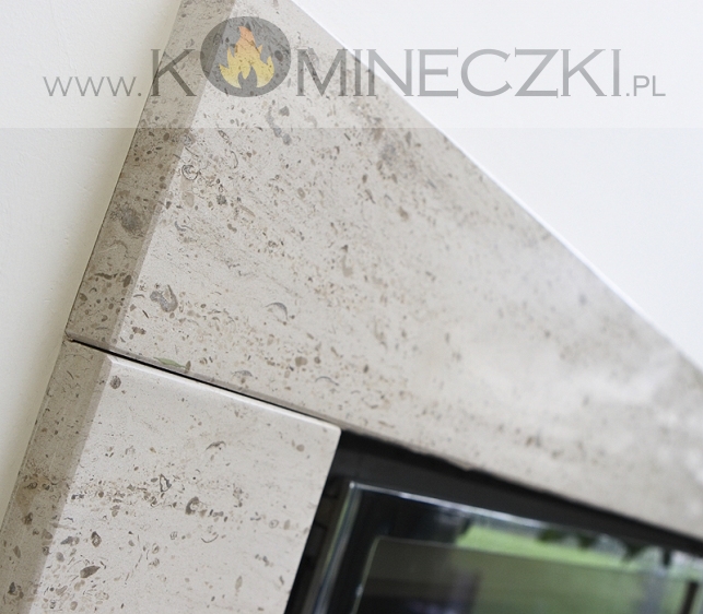 Obudowa kominka przedstawionego na zdjęciu wykonana jest z kamienia naturalnego CAPUCINO oraz MAGMOS.