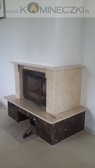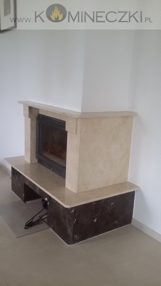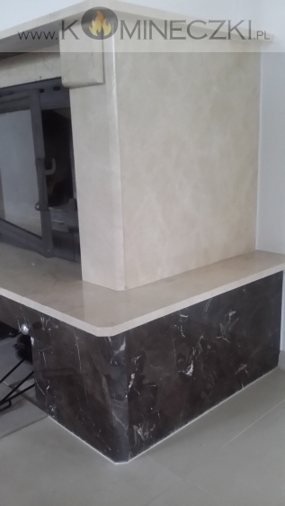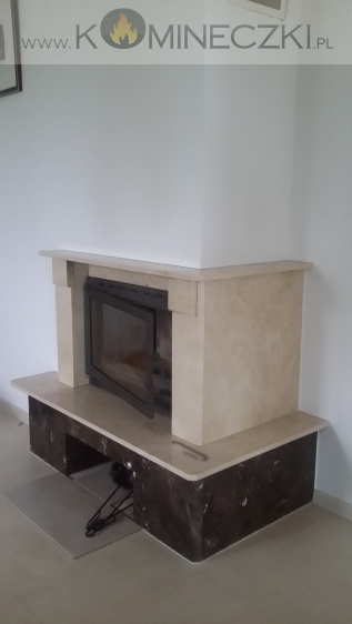Obudowa kominka przedstawionego na zdjęciu wykonana została  z naturalnego, polerowanego marmuru w kolorze beżowym.