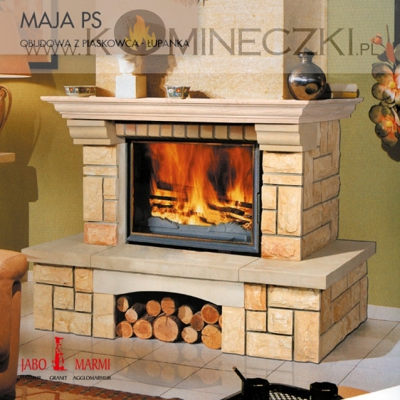 Obudowa kominka przedstawionego na zdjęciu wykonana jest z piaskowca łupanego oraz szlifowanego.