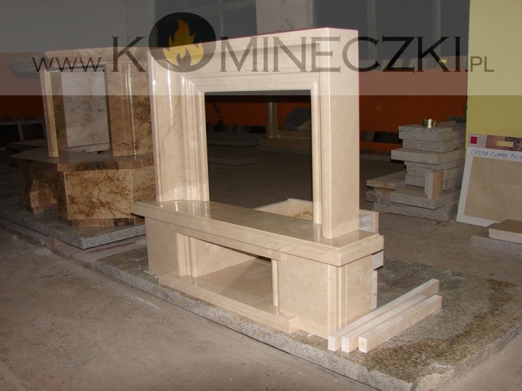 Obudowa kominka przedstawionego na zdjęciu wykonana jest z marmuru Crema Marfil.