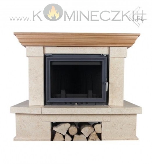 Obudowa kominka przedstawionego na zdjęciu wykonana jest z kamienia Giallo Reno, posiada również w standardzie belkę dębową frezowaną.