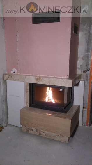 Obudowa kominka przedstawionego na zdjęciu wykonana jest z marmuru polerowanego Crema Patinato, Venge oraz drewna naturalnego Palisander.