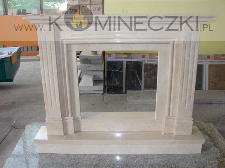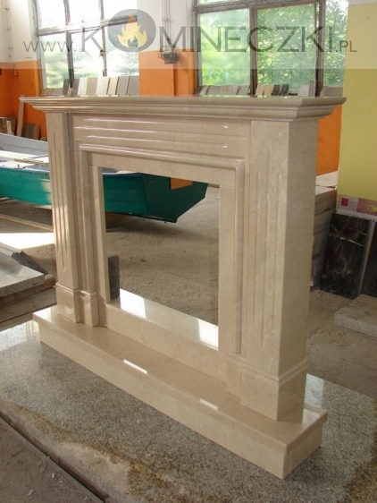 Obudowa kominka przedstawionego na zdjęciu wykonana jest z marmuru Crema Marfil.