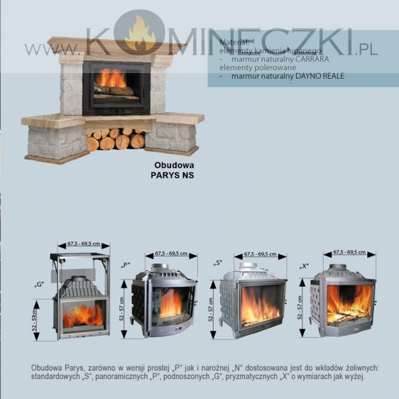 Kominek  Parys w wersji prostej jak i narożnej dostosowany jest do wkładów z szybą prostą, panoramiczną oraz