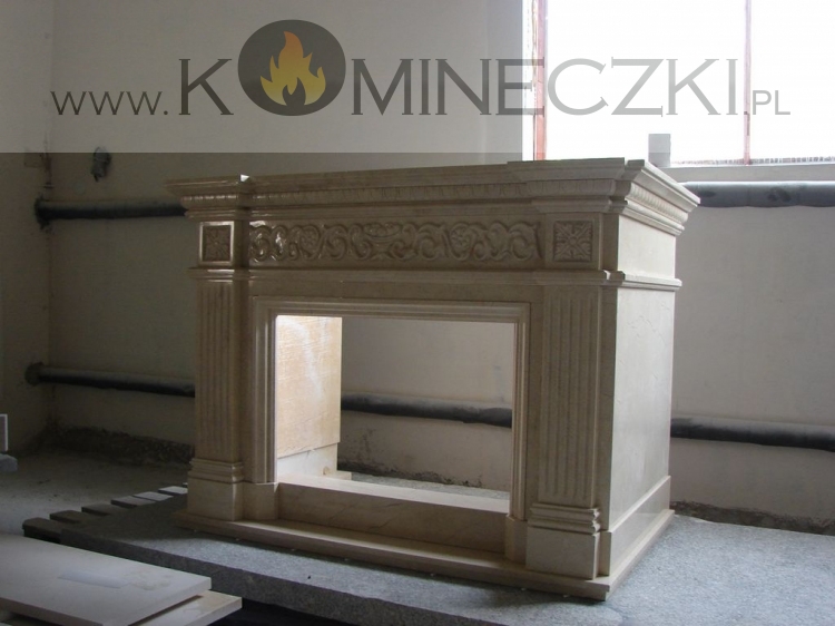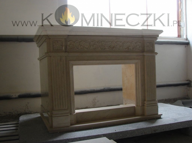 Obudowa kominka przedstawionego na zdjęciu wykonana jest z marmuru Crema Marfil.