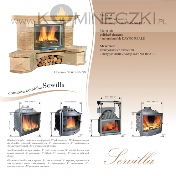 Kominek  Sewilla w wersji prostej jak i narożnej dostosowany jest do wkładów z szybą prostą, panoramiczną oraz