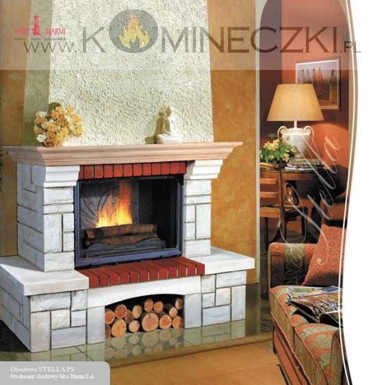 Obudowa kominka przedstawionego na zdjęciu wykonana jest z elementów kamienia naturalnego tj. piaskowiec naturalny biały oraz elementów szlifowaych tj. piaskowiec naturalny biały oraz cegła klinkierowa czerwona.