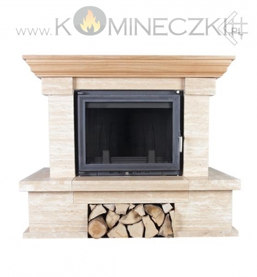 Obudowa kominka przedstawionego na zdjęciu wykonana jest z kamienia: Travertino Classico szczotkowany (belka górna, blat, cokół)