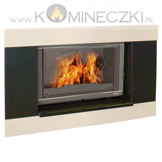 Kominek nowoczesny wykonany ze stali lakierowanej na kolor kremowy oraz grafitowy. Półka pod paleniskiem wykonana została z naturalnego granitu w kolorze czarnym.