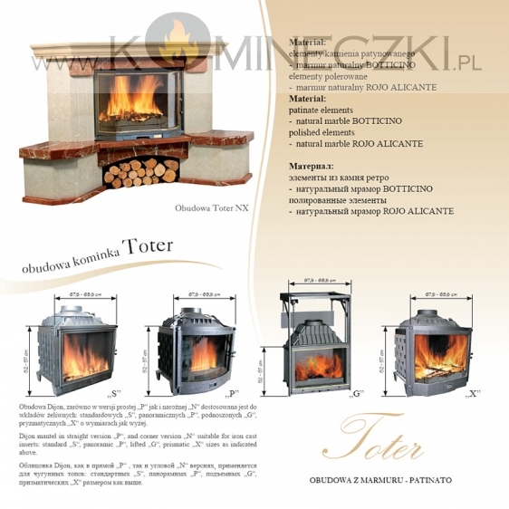Kominek  Toter w wersji prostej jak i narożnej dostosowany jest do wkładów z szybą prostą, panoramiczną oraz