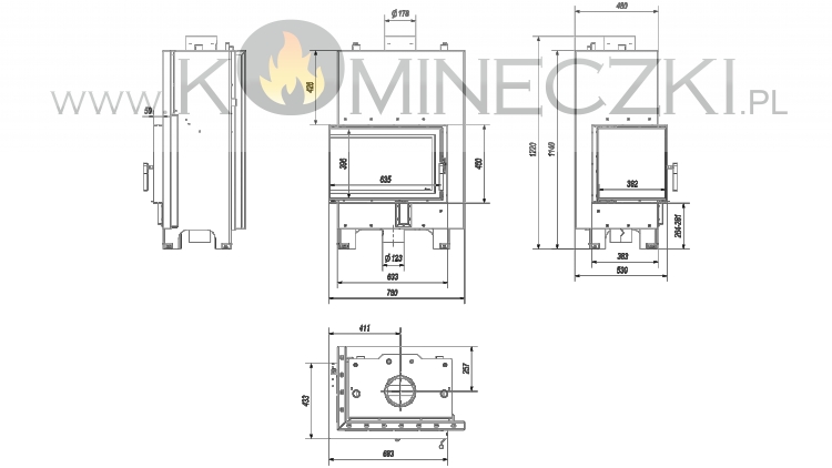 Dodatkowo we wkładzie zastosowany jest system czystej szyby (kurtyna powietrza), czyli powietrze dostarczane jest bezpośrednio na szybę poprzez system kanałów umieszczonych na bokach kominka. W ten sposób dostarczany jest tlen do górnej części komory spalania, w której następuje dopalanie gazów powstałych w procesie spalania drewna, co dodatkowo ogranicza emisję szkodliwego CO do atmosfery.