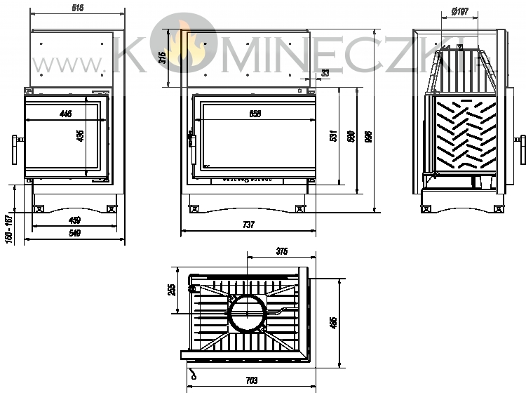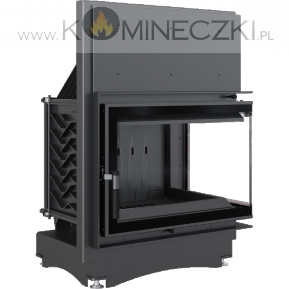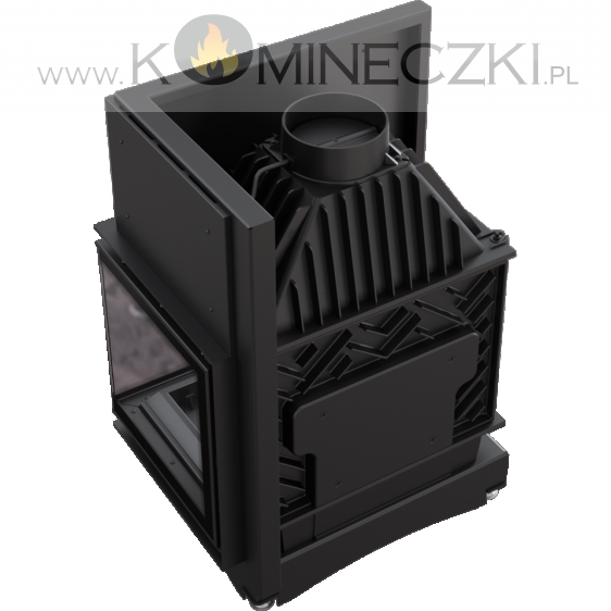 Nowoczesny front wkładu wykonany ze stali, wyposażony w dekoracyjną ceramikę żaroodporną wytrzymującą temperaturę do 800°C. Zamontowane szkło posiada certyfikat jakości i bezpieczeństwa. Ozdobna szyba typu glass, nie tylko wygląda elegancko i nowocześnie, ale przede wszystkim zastosowanie tego rozwiązania optycznie powiększa front wkładu i podkreśla wizję ognia. Rama drzwi wykonana jest z zamkniętego profilu, co sprawia, że są one stabilne i wytrzymałe na naprężenia występujące podczas pracy w wysokich temperaturach.