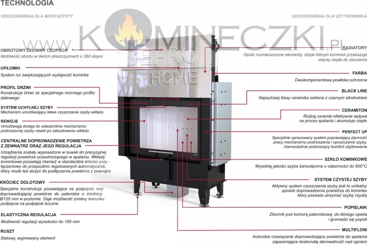 Seria wkładów z podnoszonym przeszkleniem Perfect Up, idealnie wpisuje się w nowoczesną stylistykę. Dzięki dużej szybie i wykończeniu Black Line doskonale pasuje do otwartych pomieszczeń. Wkłady kominkowe z serii DEFRO HOME INTRA G, z powodzeniem ogrzeją cały dom. Nowoczesna konstrukcja i szczelne palenisko pozwala na cieszenie się jego możliwościami w domach pasywnych oraz z rekuperacją. Autorskie rozwiązania gwarantują oszczędność energii i bezawaryjną obsługę urządzenia.