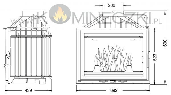 Duża szyba z czarnym zdobieniem zapewnia idealną wizję ognia